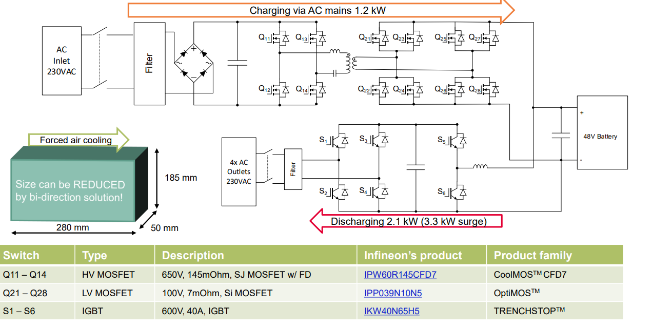 便攜式儲能AC-DC/DC-AC部分的英飛凌應用方案和產品選型,下面是充電1.2KW/放電3.3KW的參考方案和推薦的功率器件的型號。