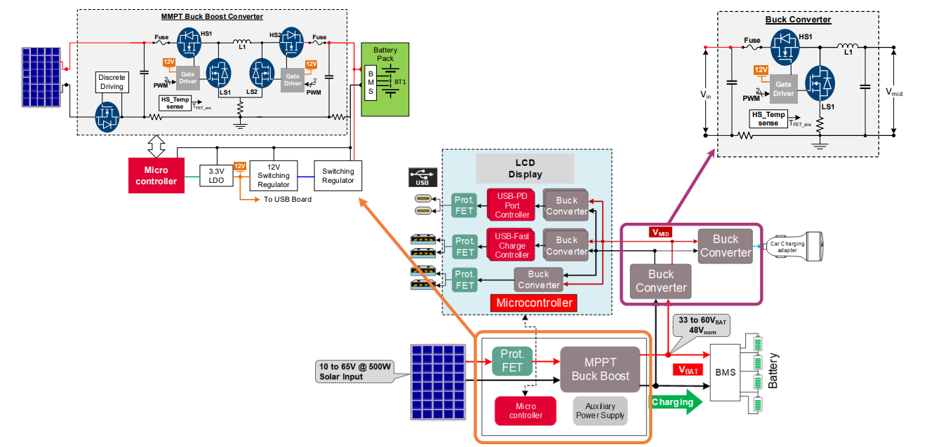 英飛凌針對便攜式儲能DC-DC部分也有針對性的選型參考(Buck-Boost/Buck Converter),從下圖中的框圖我們可能看到,該方案中太陽能MPPT、Car port plug和USB-C 三個部分都有用到DC-DC。