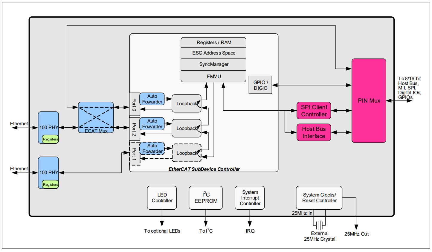 ○ 帶3個(gè)現(xiàn)場(chǎng)總線(xiàn)存儲(chǔ)器管理單元 (Fieldbus Memory Management Unit,F(xiàn)MMU)和4個(gè)SyncManager(同步管理器)的2/3端口EtherCAT從控制器