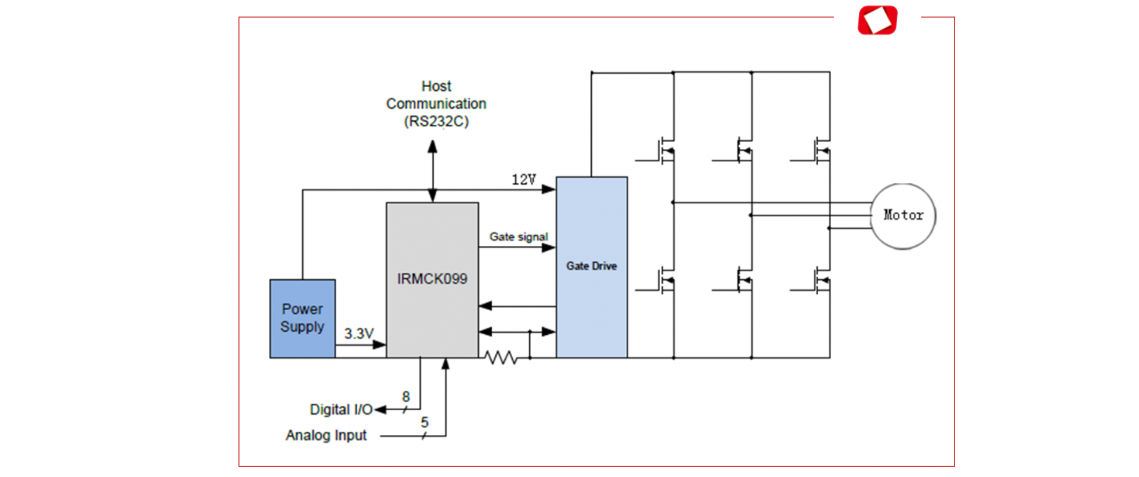 Infineon公司的IRMCK099是永磁同步馬達(PMSM)無傳感器磁場定向控制(FOC)可變速度馬達控制集成電路(IC)。